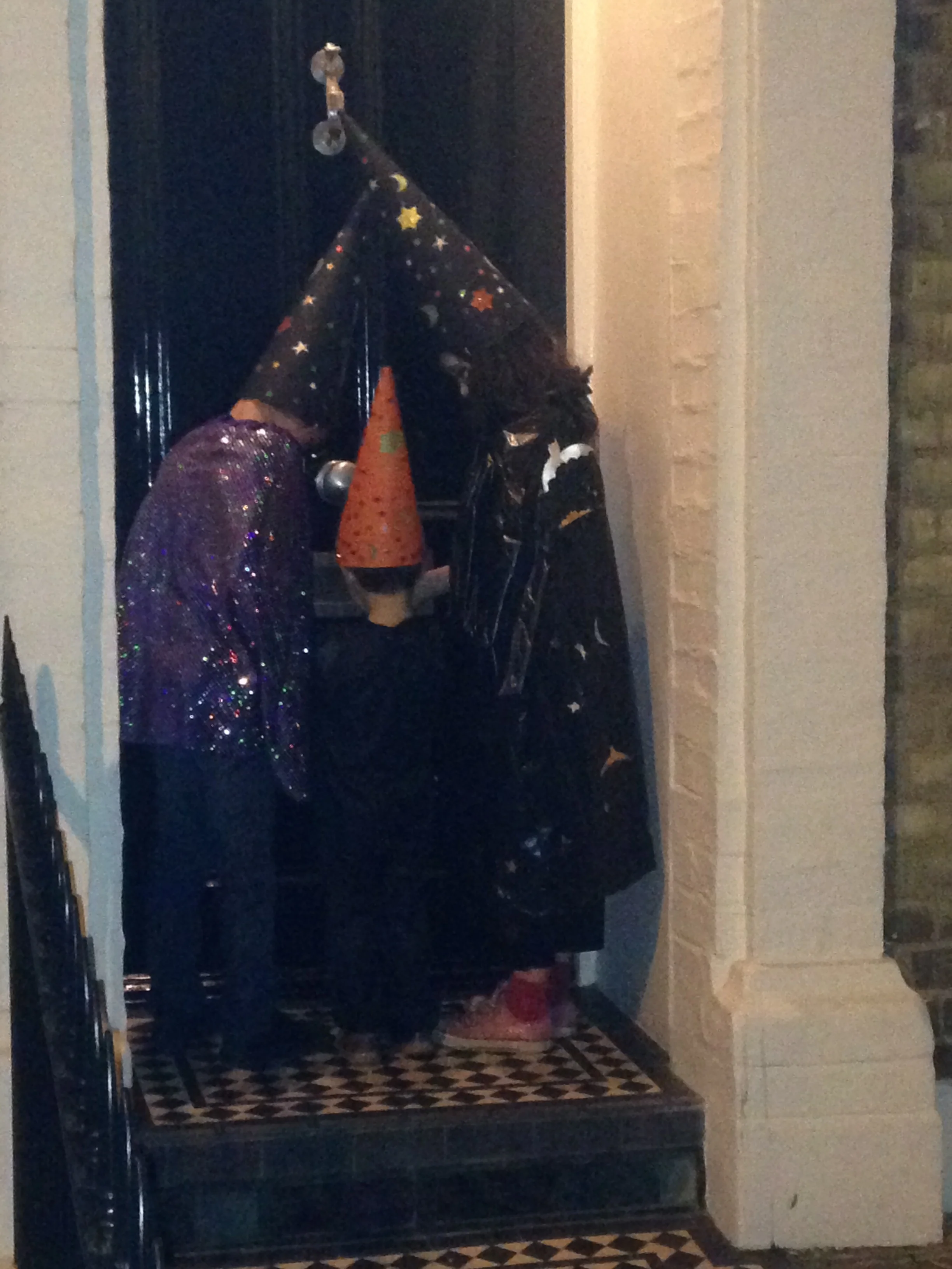 ...as my 3 year old son described it. Spurred on by the children's enthusiasm for making their costumes, we embarked on a session of 'trick or treat'. No tricks thankfully, but plenty of crazy halloween door decorations around Shepherds Bush to terrify our 9 year old! Somehow seems wrong to just ring on a doorbell and receive sweets...next year I think they must perform something...but their homemade hats sufficed this year. One lady even donated £3 to their basket as she walked down the street.