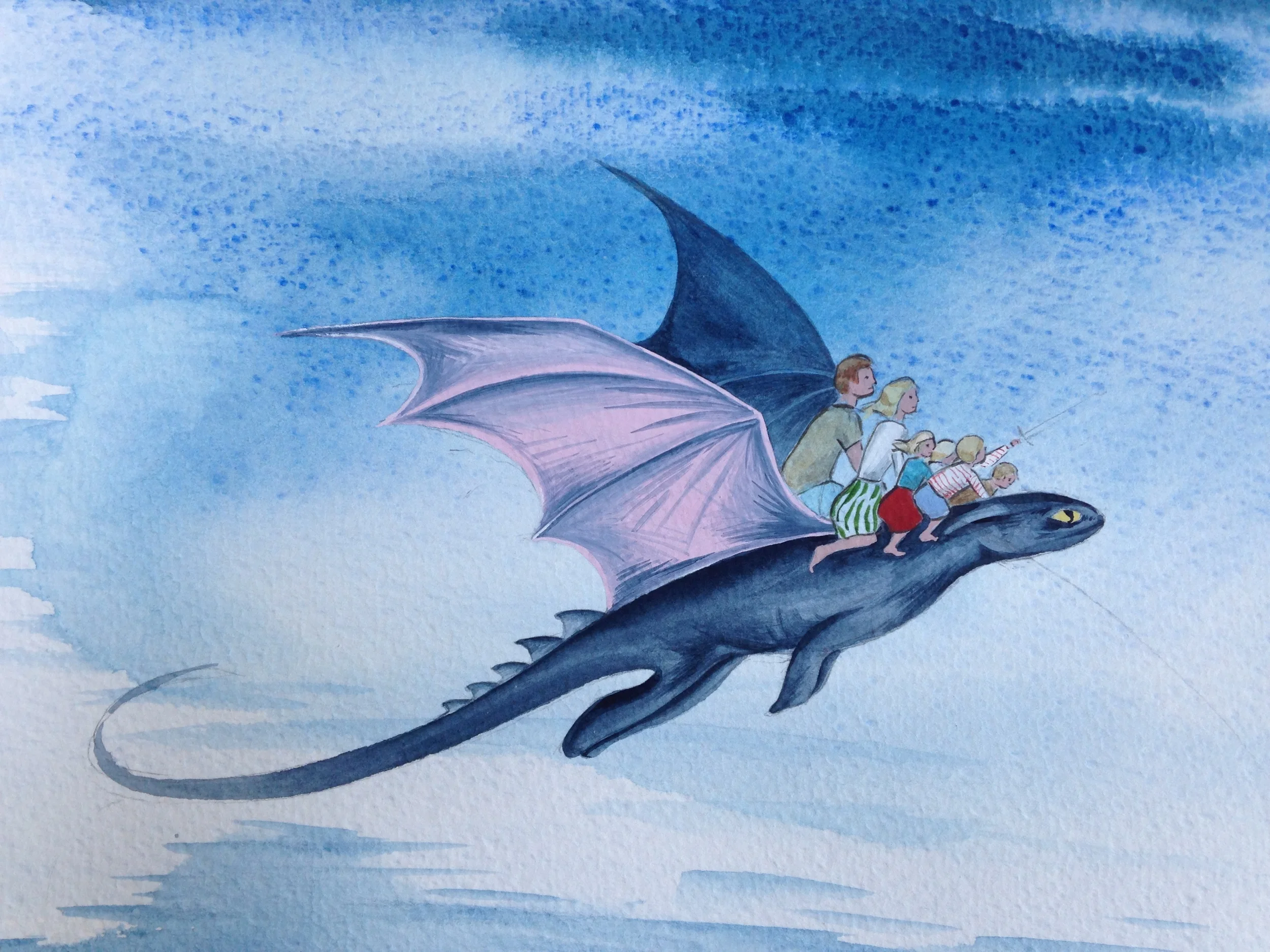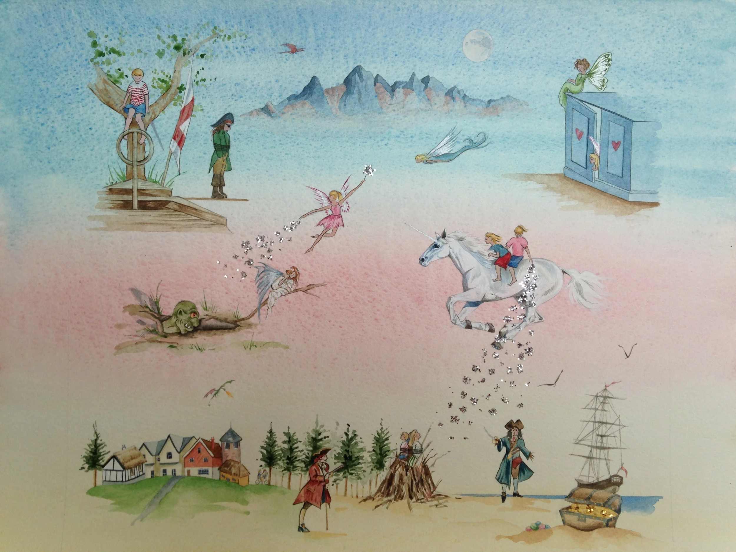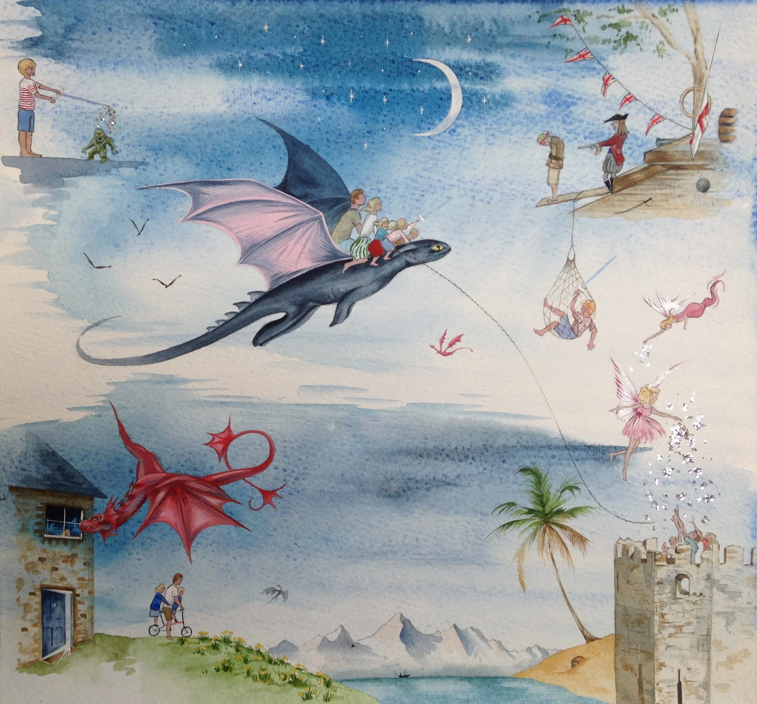 I have just started on the first of two pictures about imagination. A father I know who tells wonderful made up stories to his children about dragons and fairies and pirates and treasure chests and dramatic rescues from the jaws of Cyclops by his children on unicorns, has asked me to incorporate all of this and more in a picture for each of them for Christmas. Specific requests so far have included 'Toothless' from How to Train your Dragon, a magic door, a field of daffodils and a pirate ship based on the decking in their garden, to name a few....and good dragons must have pink wings underneath...